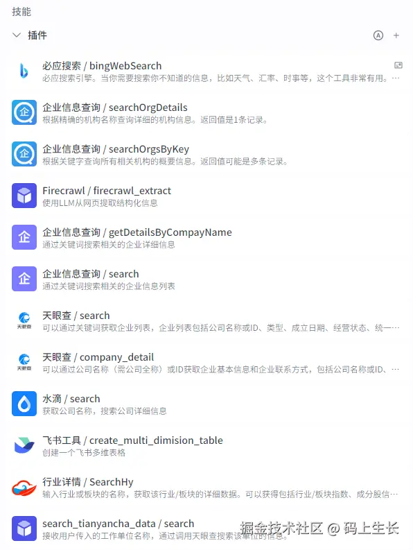 然后扣子平台会根据提示词自动添加插件,用于加强智能体的功能,如下所示: