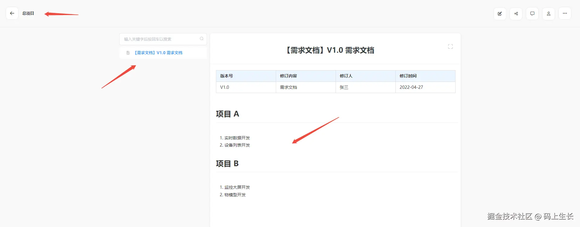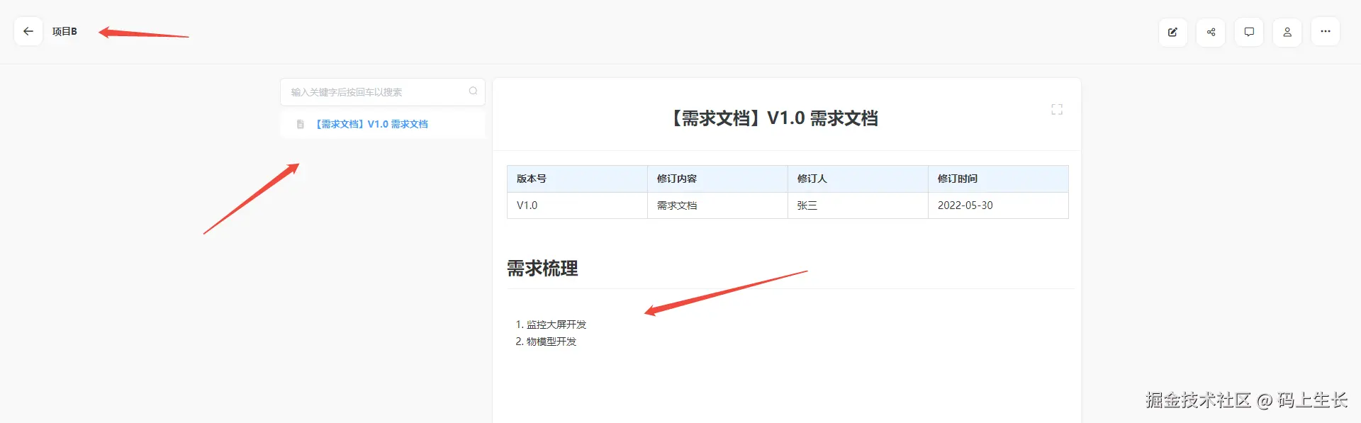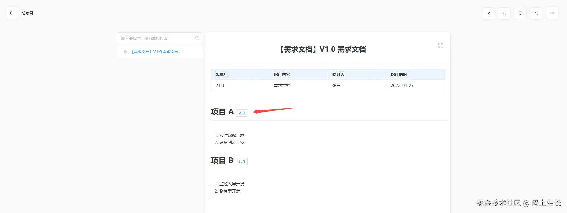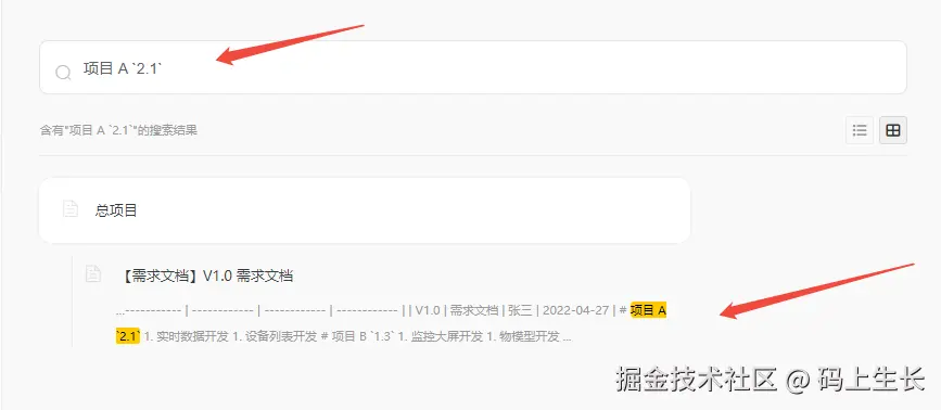 如果要在该文档系统中列出项目 A 某个版本的全部需求(比如 V2.1 ),可以在搜索框使用【项目 A 2.1】进行搜索,这样相关内容就能全部罗列出来。