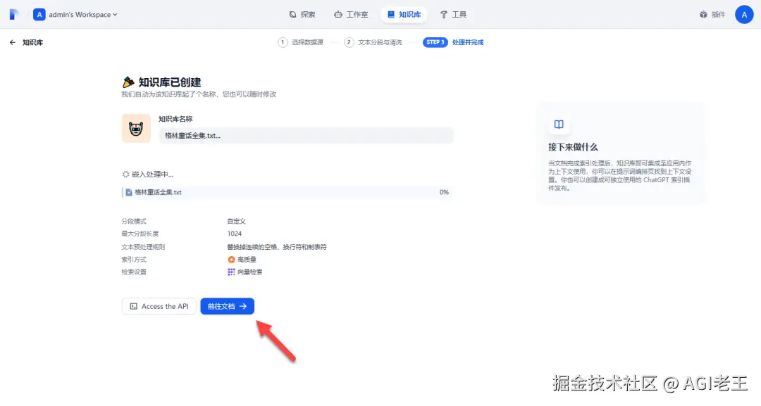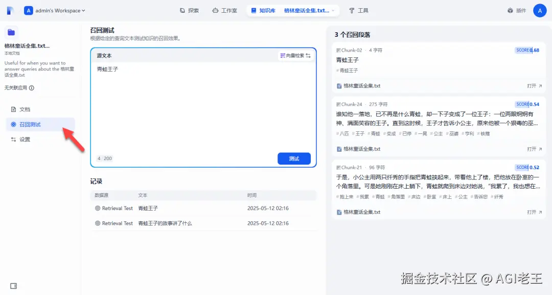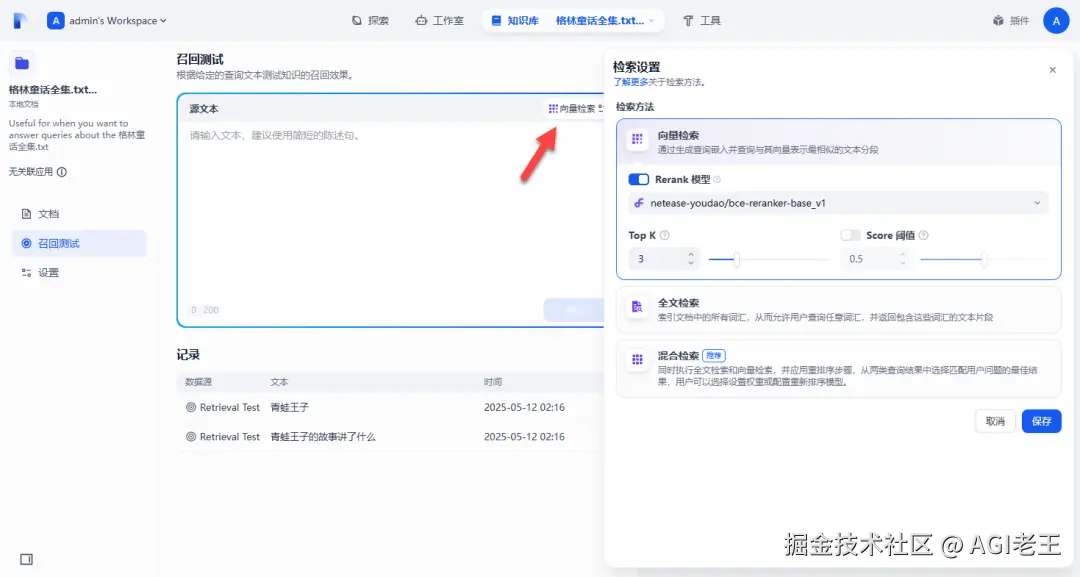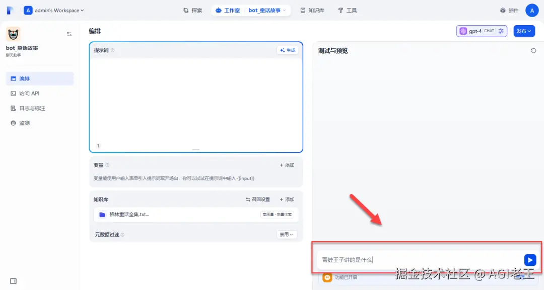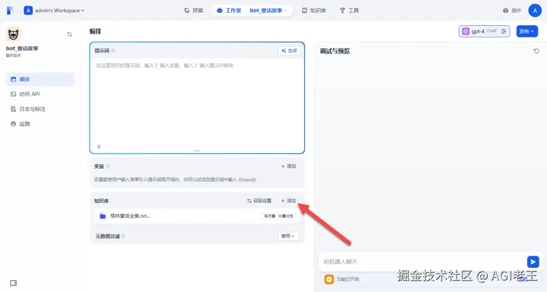 这里添加之前创建的知识库(不然就和普通调用 API 问答没区别了)