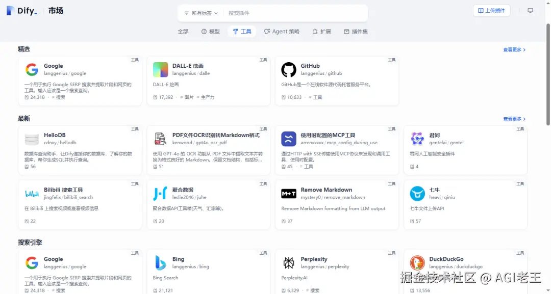 - 代理能力: 您可以根据 LLM Function Calling 或 ReAct 定义代理,并为代理添加预构建或自定义工具。Dify 为 AI 代理提供了 50+ 内置工具,例如 Google 搜索、DALL·E、稳定扩散和 WolframAlpha**。