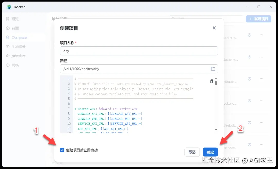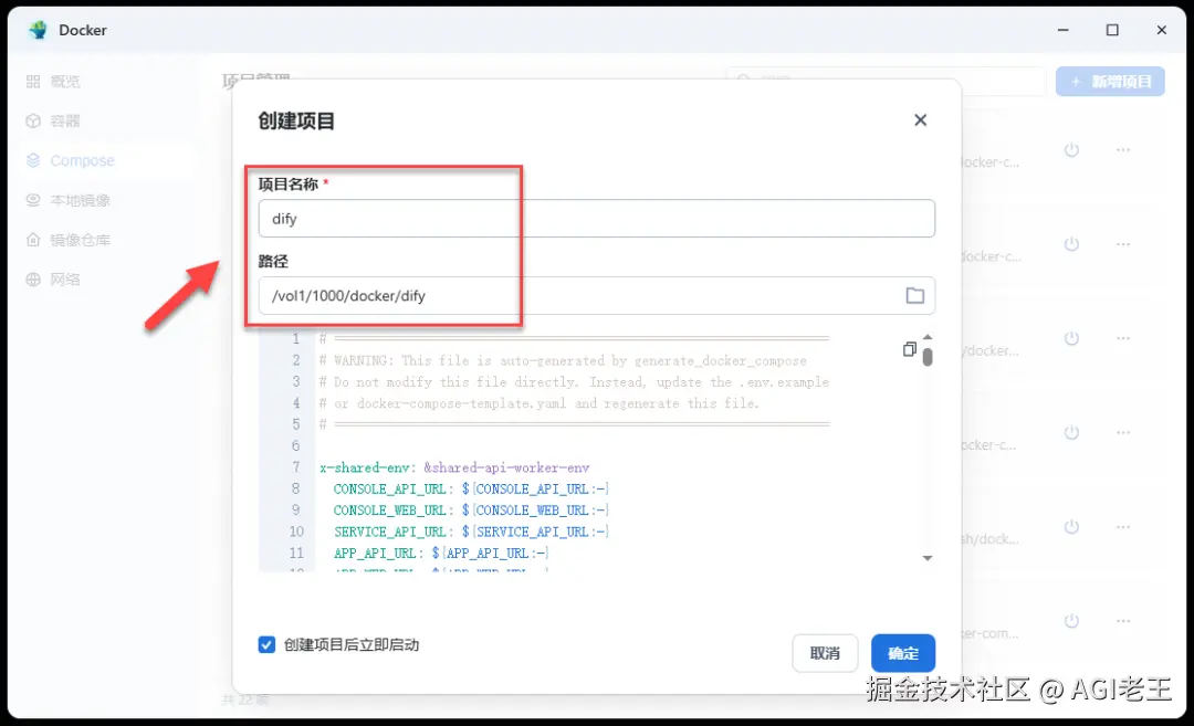 填写名称,路径选择 dify 的路径就行(会提示已经有模板文件,选用就行)