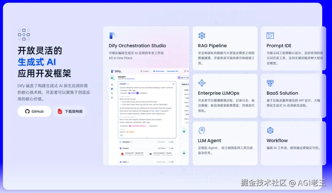 一个开源的 LLM 应用程序开发平台。提供从 Agent 构建到 AI workflow 编排、RAG** 检索、模型管理等能力,轻松构建和运营生成式 AI 原生应用。