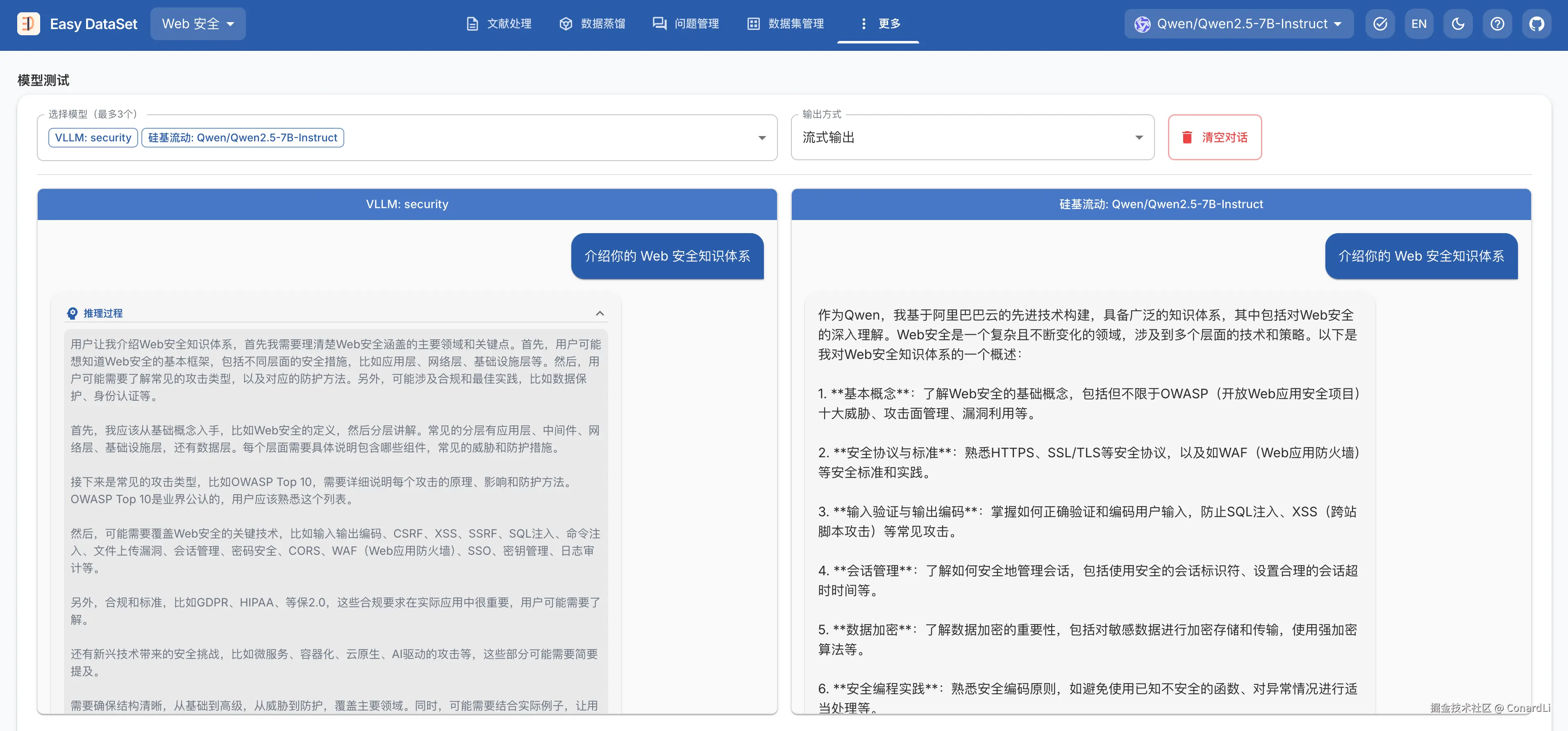 注意:在非 Web 安全领域下,模型并不一定能够稳定输出推理过程,因为我们仅针对 Web 安全领域的数据集进行了训练,这在一定程度上激发了模型的推理能力,想要让模型在更多领域稳定输出推理过程,需要更丰富的数据集