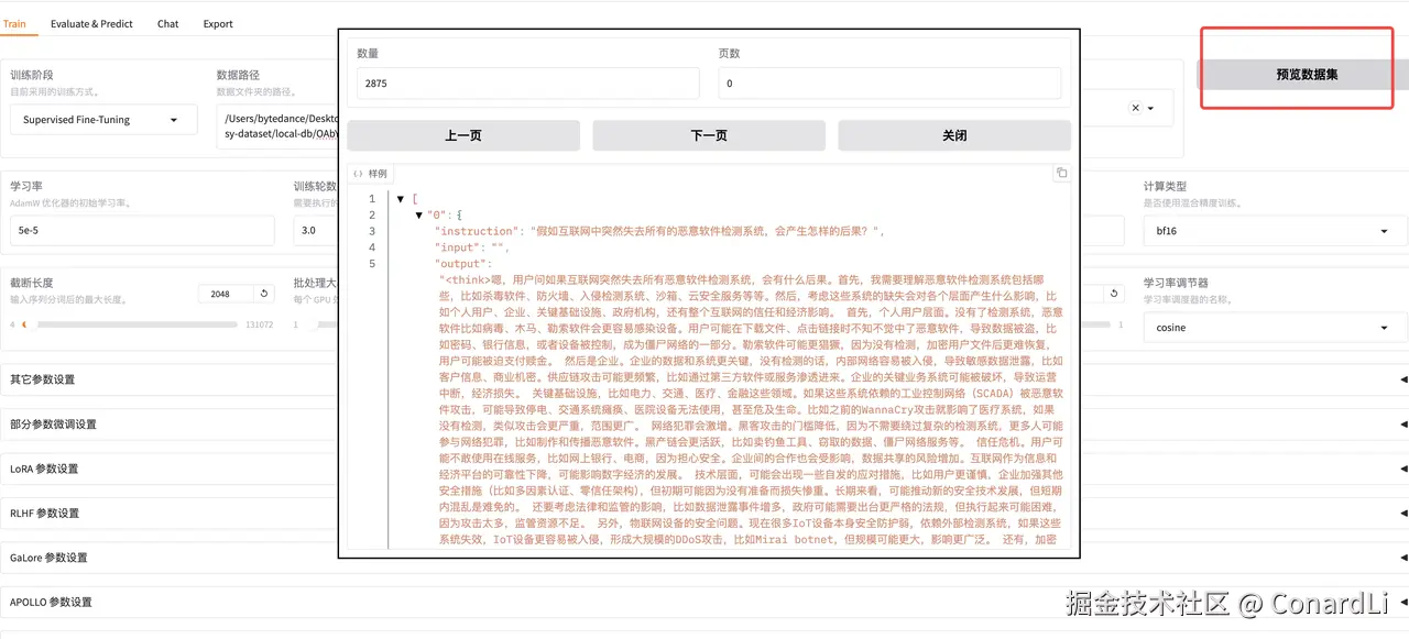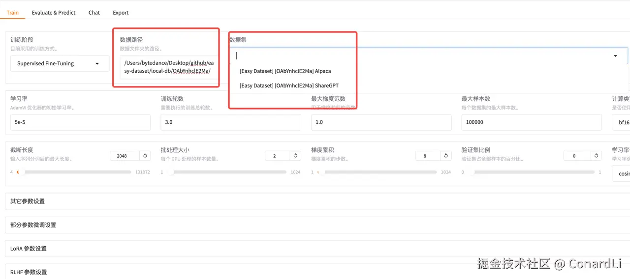 我们看到 LLaMA Factory 提供了两个数据集相关的配置:数据路径和数据集(名称):