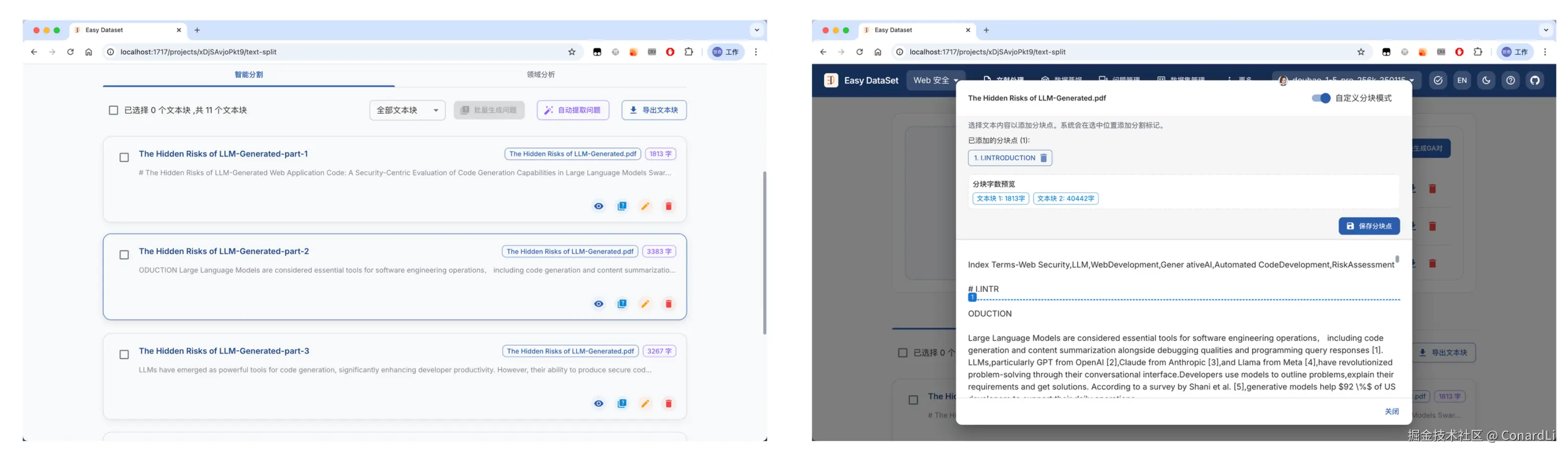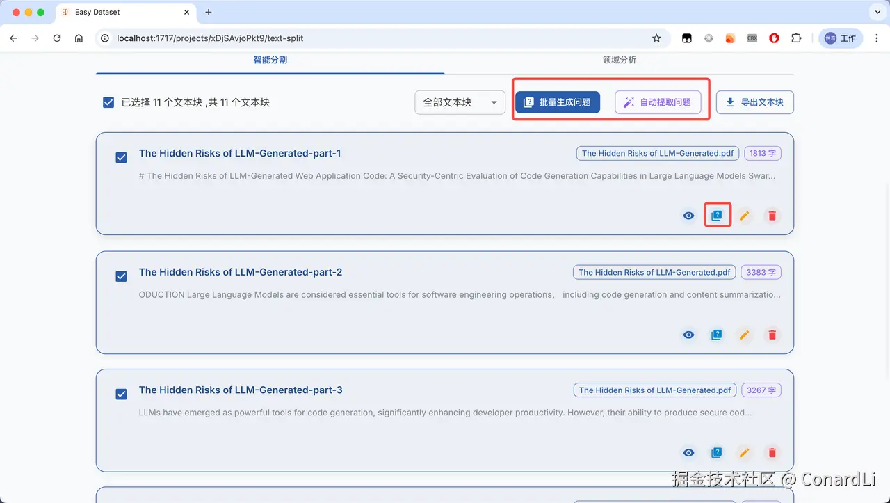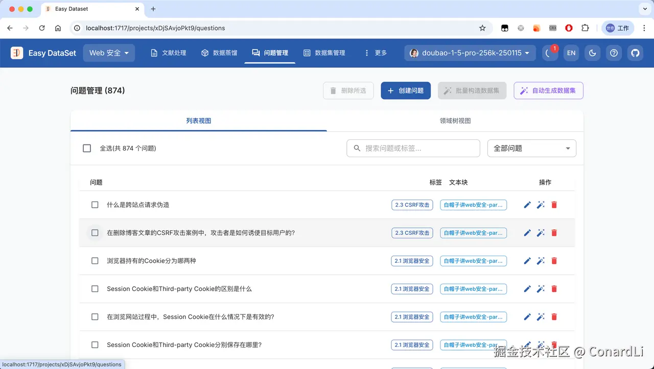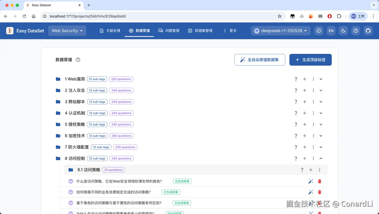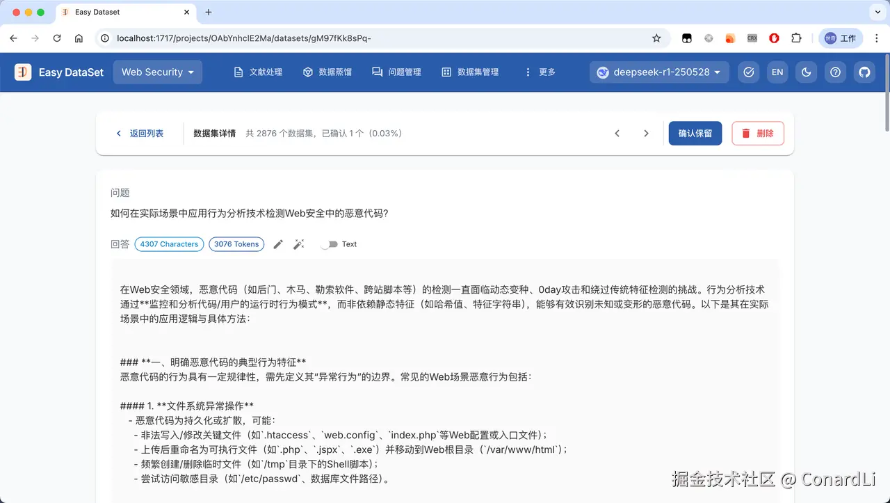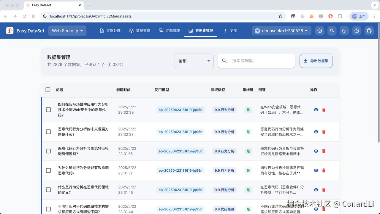 随后可到【数据集管理】Review 已生成的(从文献中提取的 + 从大模型蒸馏来的)数据集: