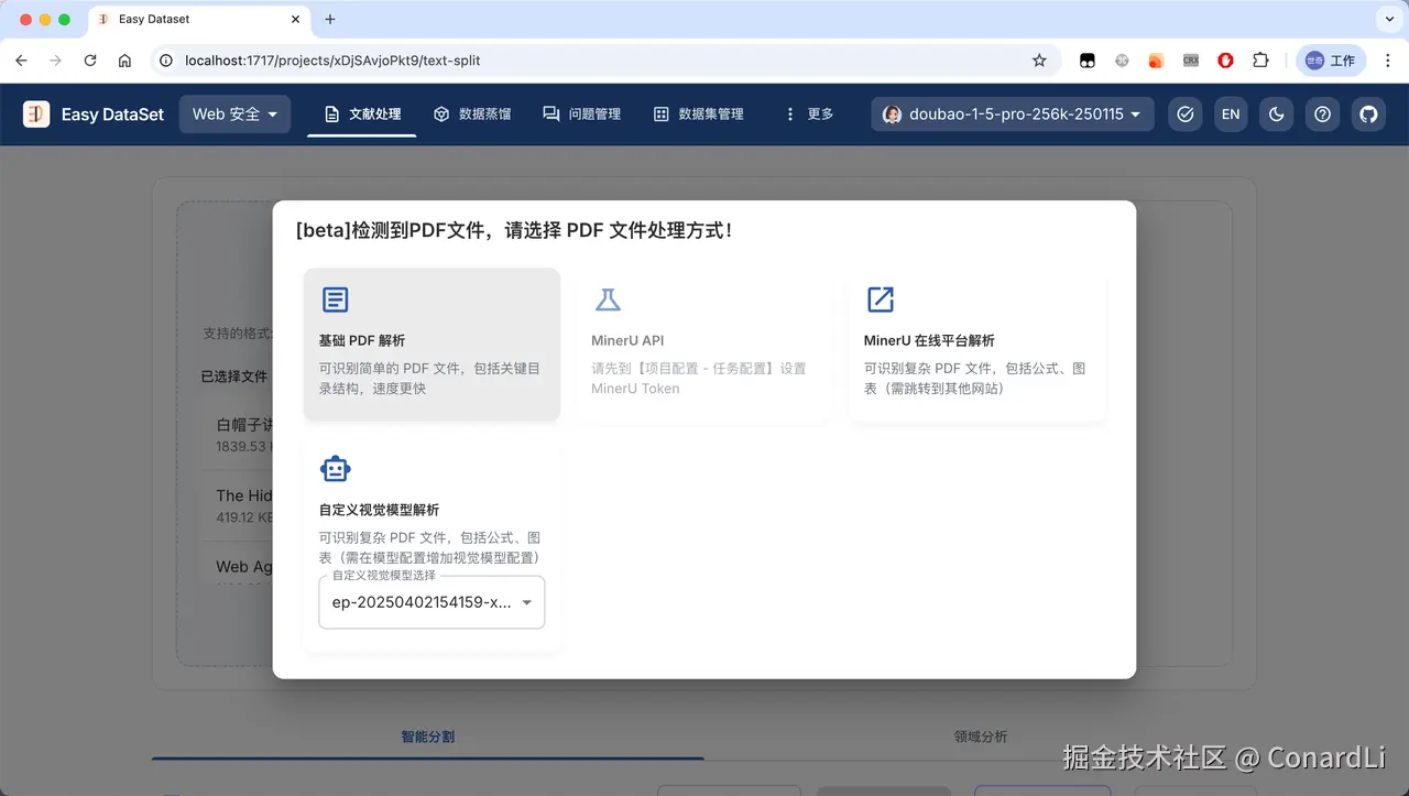 进入【文献处理】,上传我们已经准备好的文献(1个书籍+3篇论文),选择 PDF 解析方式: