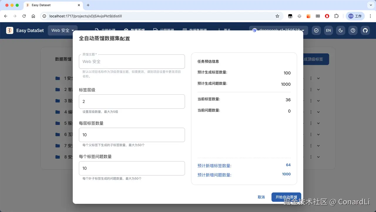 为确保模型能够学习均衡,不遗漏 Web 安全领域的知识,弥补和满血版大模型的差距,我们选取更为强大的满血版大模型(DeepSeek R1 0528)作为教师模型来蒸馏部分数据集;进入【数据蒸馏】,选择【全自动蒸馏数据集】,配置要蒸馏的标签层级和单标签生产问题数量: