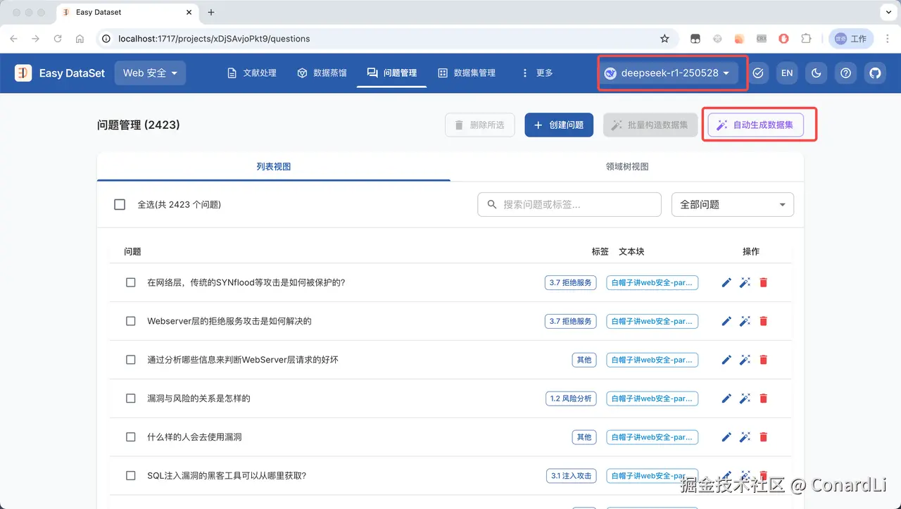问题 Review 完成后,将模型切换为推理模型(DeepSeek R1),点击自动生成数据集: