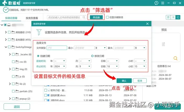 步骤2: 如果扫描出来的文件还是过多,用户可以选择使用“筛选器”来进一步缩小搜索目标文件的范围;选中文件后点击“导出”,将扫描出来的文件进行恢复;