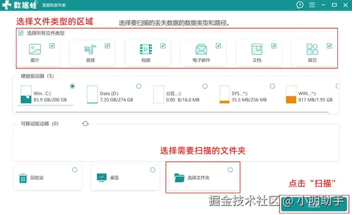 步骤1: 在电脑桌面中打开数据 蛙恢复专家,进入软件首页,可以在上方自由选择需要扫描恢复的文件类型,然后在硬盘区选取自己需要扫描的硬盘,最后点击“扫描”;