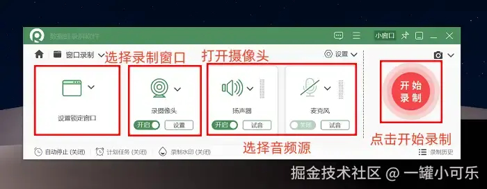 步骤2:选定打算录制的窗口,然后框选PPT的播放区域。别忘记勾上 “扬声器”和“麦克风” 哦。录制之前,我们还可以根据个人习惯设置好摄像头的具体参数。搞定后点击 “开始录制” 按钮开始你的表演。