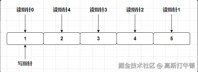 当下一个数据进来后,写在地址2,读取过程启动,从2地址开始读取,然后从1地址读取,直到读到3地址结束,最后当写指针前进到5地址,完成整个读的行为后,写指针此时需要回到1地址,再继续重复上述的操作。