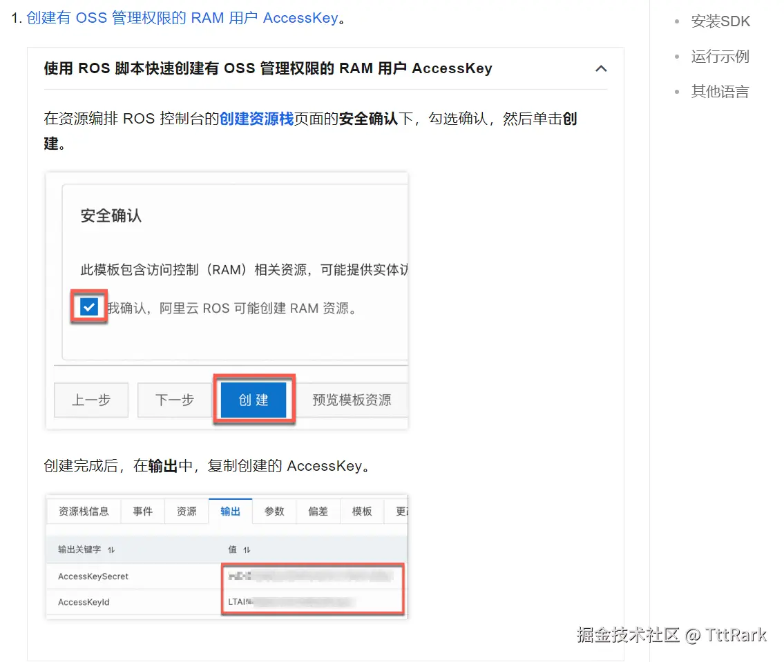 创建认证私钥可以通过多种方式,这里通过官方开发文档中的ROS脚本进行快速创建。在资源编排ROS控制台的创建资源栈页面的安全确认下,勾选确认,然后单击创建。