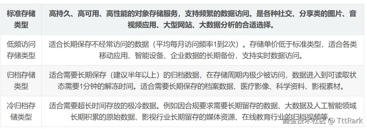 - 提供标准、低频访问、归档和冷归档四种存储类型,全面覆盖从热到冷的各种数据存储场景: