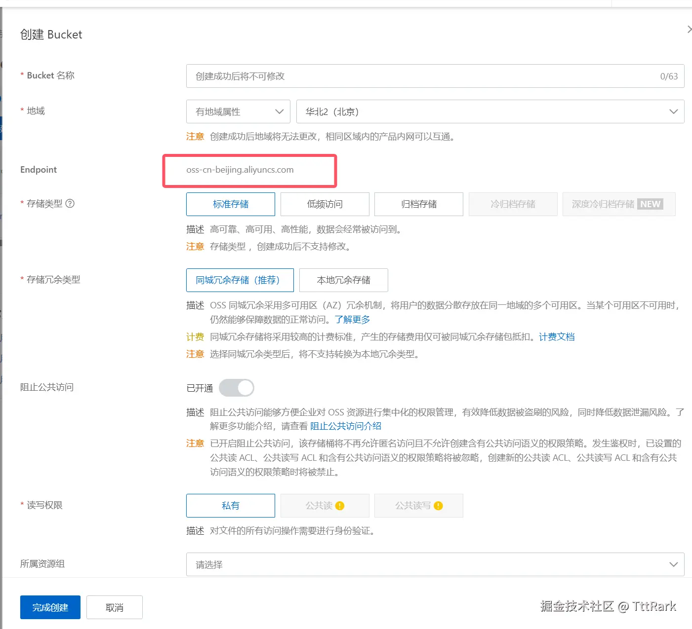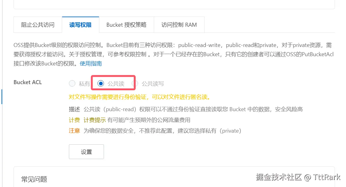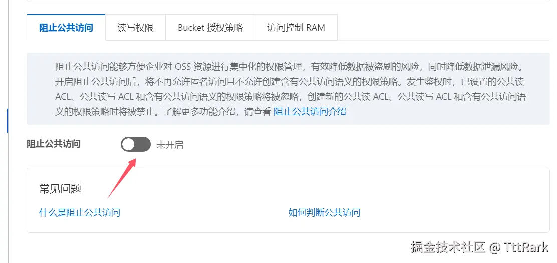 Bukket创建完成后默认为阻止公共进行访问,若需要自己的本地前端访问数据,可以将阻止公共读关闭,并授权ACL为公共读。