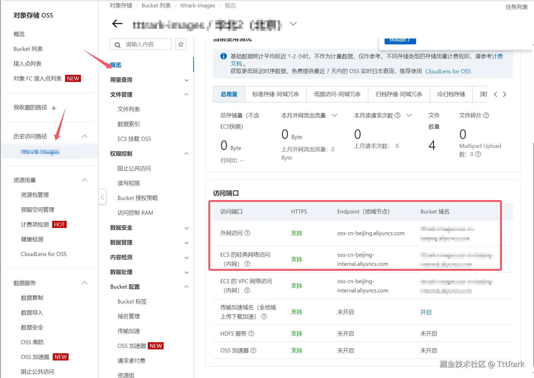 创建Bucket需要记住Endpoint以及Bucket名称,以便后续在配置文件中使用,Endpoint可以在bucket详情中点击概览进行查看。