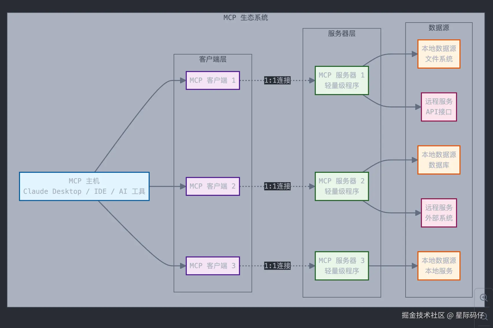 - MCP 客户端:与服务器保持 1:1 连接的协议客户端