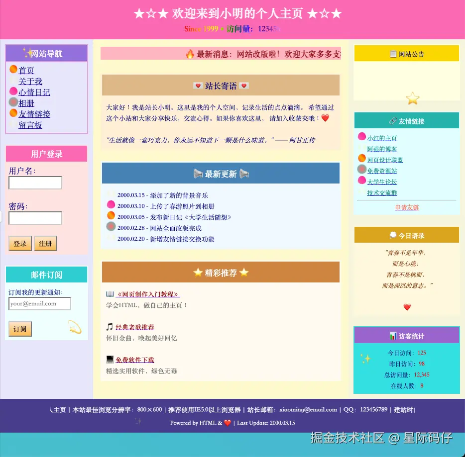 请帮我设计一个“2000年左右风格”的个人网站,要求页面使用表格布局(而非CSS布局),有彩色背景、GIF小图标、滚动文字(marquee)、电子邮箱订阅框、友情链接、小型导航栏、页面信息密集,整体风格复古、有怀旧感,像早期大学生做的手工网页。