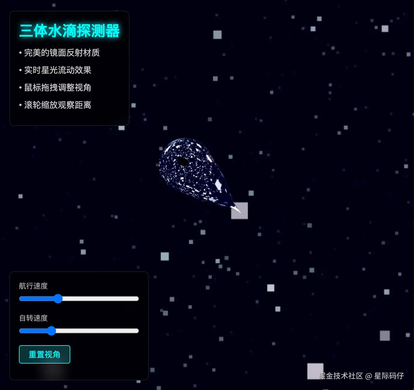利用它,我们可以构建出令人惊叹的 3D 交互场景,比如《三体》中“水滴”探测器的航行演示: