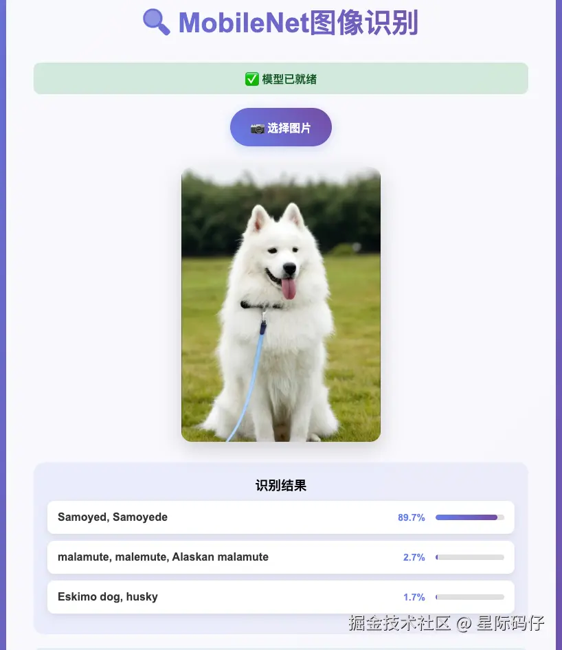 例如,我们可以利用预训练的 MobileNet 模型,快速创建一个能够识别日常物体的图像识别程序: