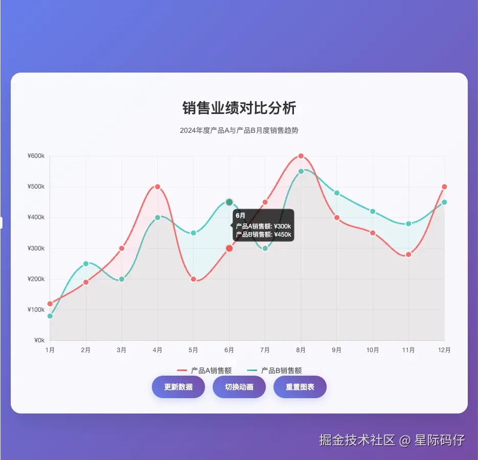 使用Chart.js实现一个带渐进动画效果的双线对比折线图。