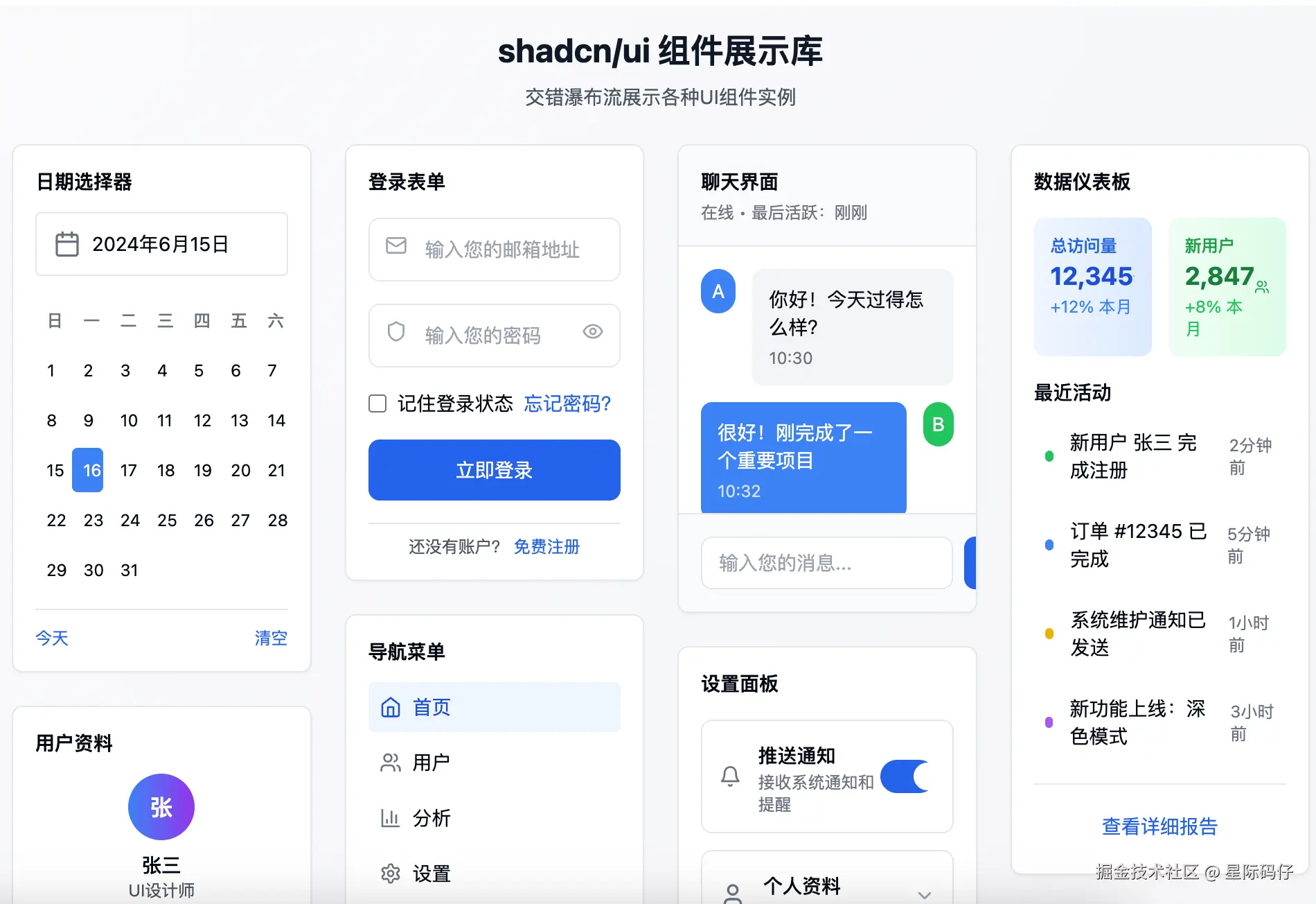 提供一个以“交错瀑布流”的形式展现的例子库,展示使用shadcn/ui构建用户界面的各类 Web 应用页面实例,例如日期选择页、登录页、聊天记录、反馈页、设置页等。