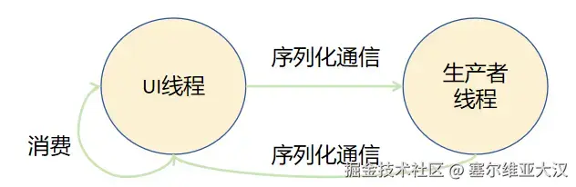 Actor模型不同角色之间并不共享内存,生产者线程和UI线程都有自己独占的内存。生产者生产出结果后通过序列化通信将结果发送给UI线程,UI线程消费结果后再发送新的生产任务给生产者线程。
