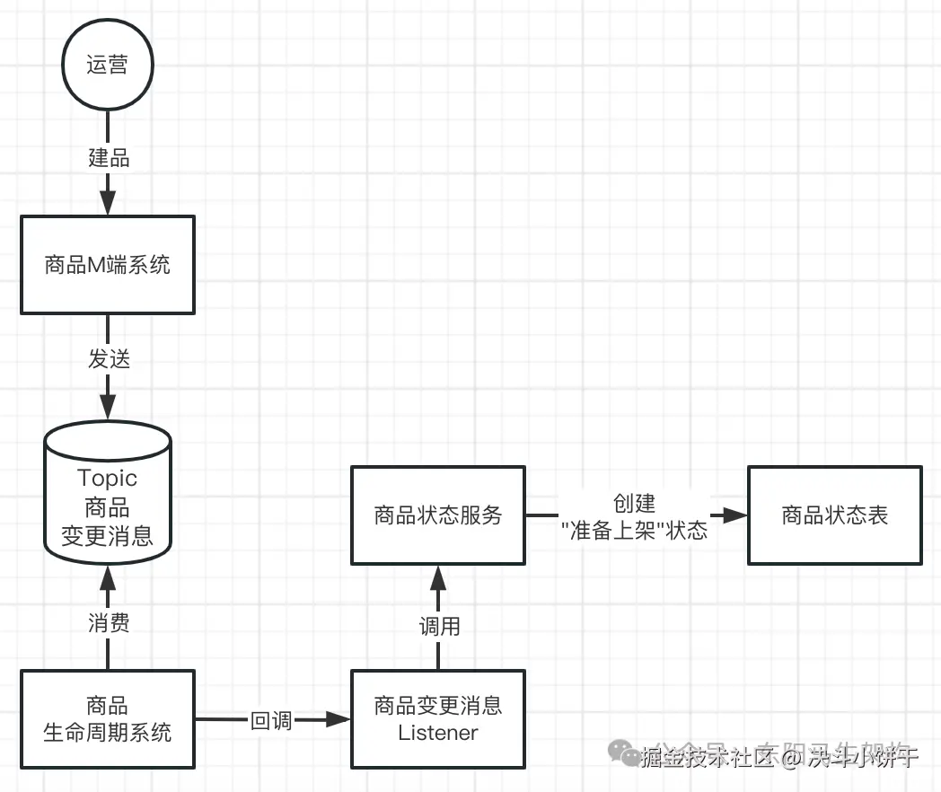 商品M端系统建品后会发送MQ消息,商品生命周期系统会订阅该消息,然后创建该商品的准备上架状态,并且当消息消费失败时可以主动调⽤接⼝创建商品状态。