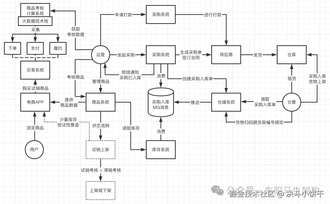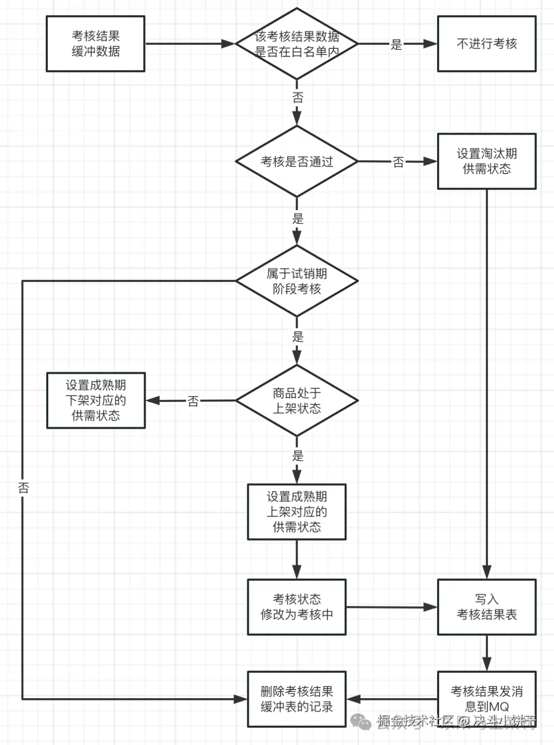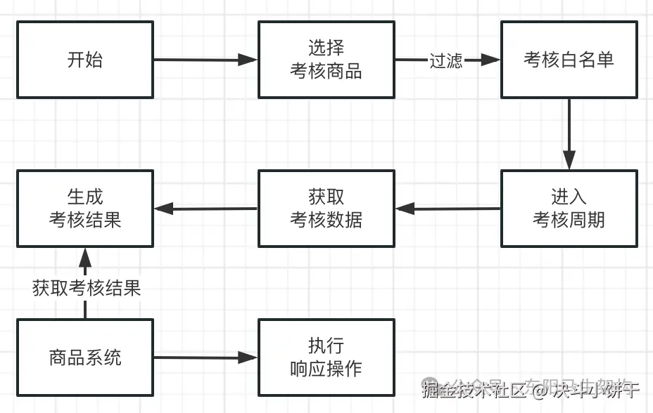 商品主要在试销期、滞销期存在考核。在考核过程中,根据⼀定的考核规则,例如销量、退单率、投诉率等,对商品进⾏考核。考核不通过的商品,会⽣成考核不通过的记录。考核通过的商品,继续进⾏考核、或暂停考核。考核不通过的记录,会影响商品库存系统的采购、补货等操作。