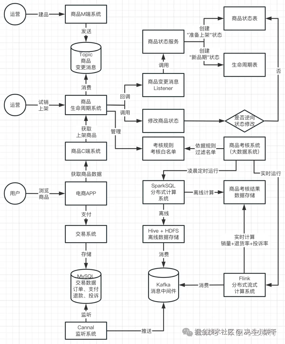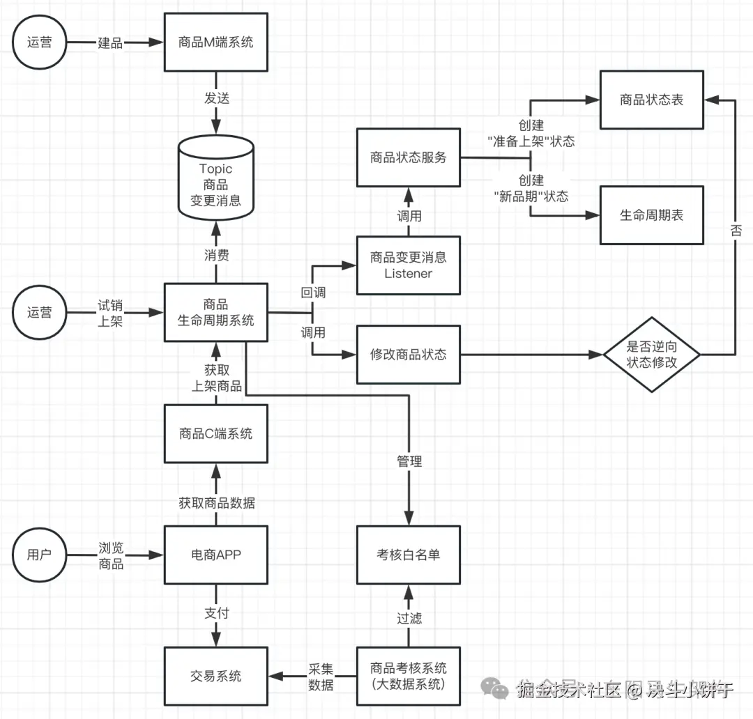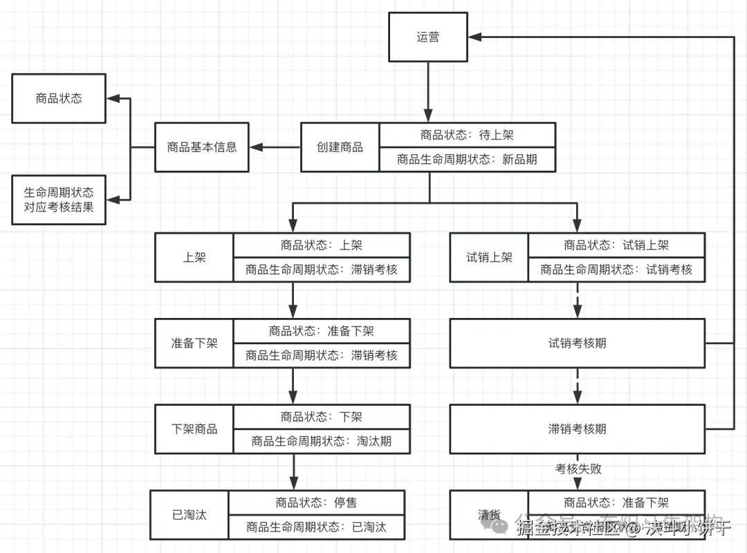 在商品系统修改商品状态时,商品⽣命周期系统会接收到MQ消息,然后根据消息体中的商品状态,同步更新商品对应的⽣命周期状态。例如:商品状态从准备上架 -> 试销上架,那么商品对应的⽣命周期状态需要从新品期 -> 试销期。