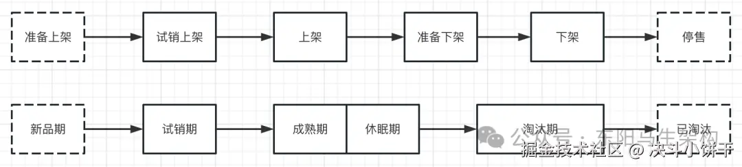 商品⽣命周期主要跟随商品状态的变化⽽变化,商品本身的状态主要有如下⼏种:准备上架、试销上架、上架、预下架、下架、已停售。