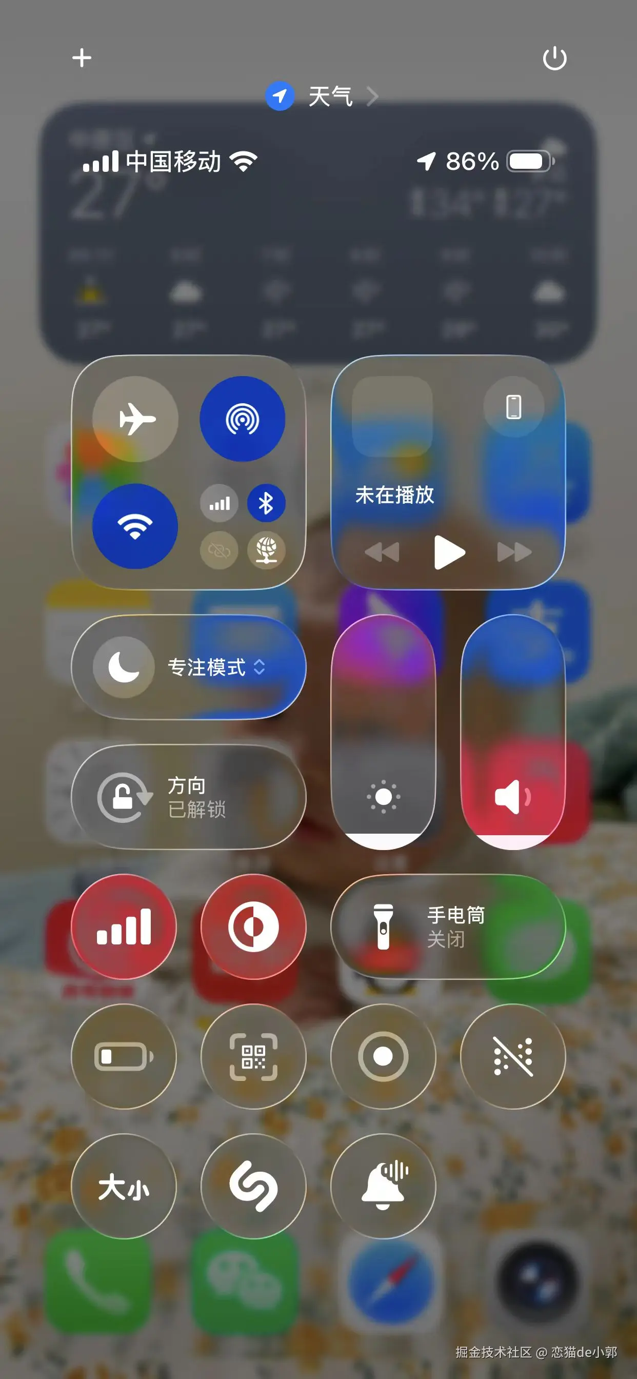 当然,很多人可能说,不就是一个毛玻璃效果吗?实际上还真有些不大一样,特别是不同控件的“模糊”和“液态”效果都不大一样,效果好不好看一回事,但是液态玻璃确实不仅仅只是一个模糊图层,至少从下面这个锁屏效果可以看到它类似液态的扭曲变化: