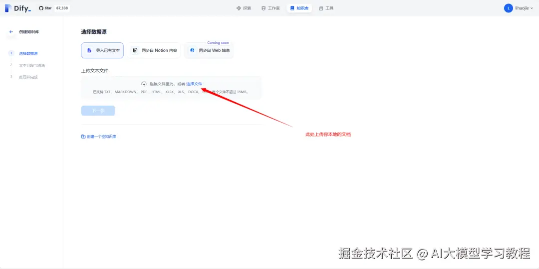 数据源可选导入已有文本、同步自Notion内容、同步自Web站点(暂未上线) 导入已有文本:即你需要作为外部知识让大模型去检索回答的内容,可能是个商业计划模板、也可能是个销售数据表。 同步自Notion内容:Notion是一款团队协作工具,类似于钉钉文档、语雀文档等,可以在其中以高度自定义的方式组织工作、管理项目和存储信息。也有提供API给其他应用调用。这里就是Dify对接了Notion,可以从Notion中导入信息到知识库中