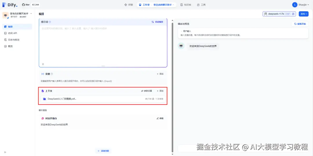 既然我们是聊天机器人,先设置一个开场白,点击开启,我是设置成了“欢迎来到DeepSeek的世界”