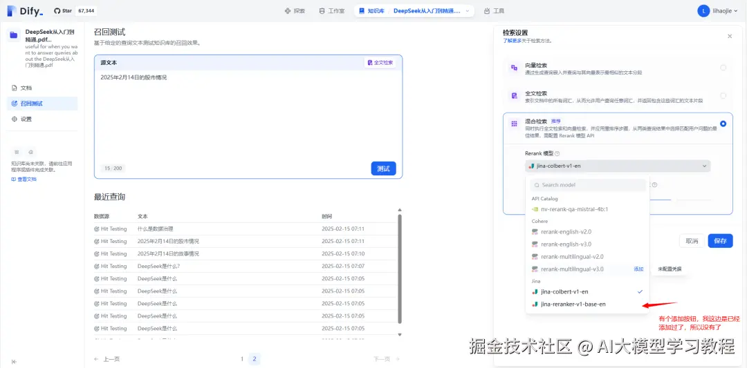 混合检索需要设置一个重排序模型,如果本地没有安装的话,可以选择使用jina的API。