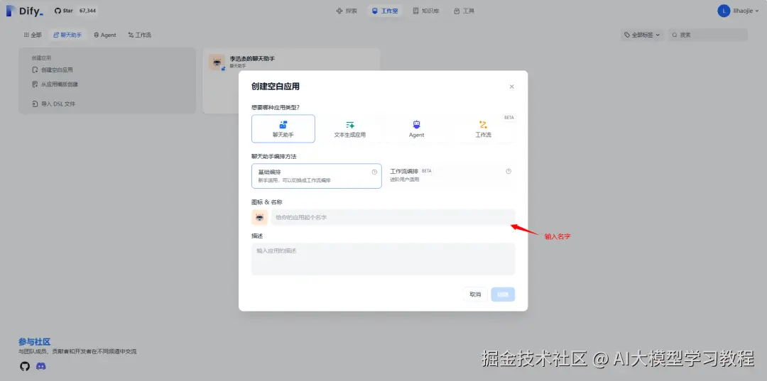 工作室中包括了聊天助手、Agent、工作流,可以在工作室中根据自己的需求创建相关应用。后面会对该功能做详细解释