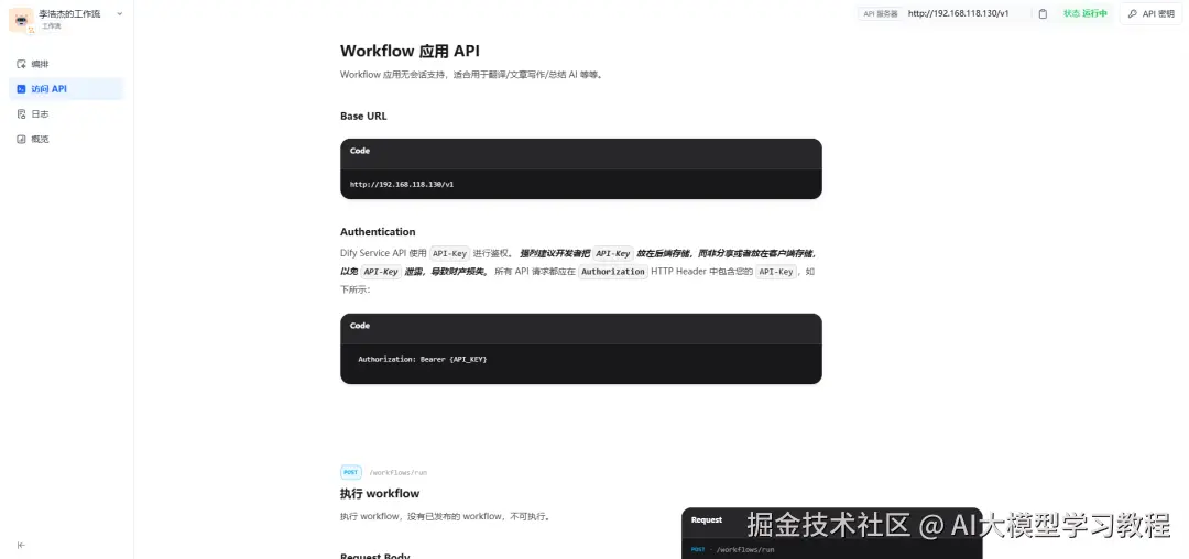Dify提供了对应的工作流API,可以嵌入到应用中进行使用,方法与前面介绍的聊天助手相似