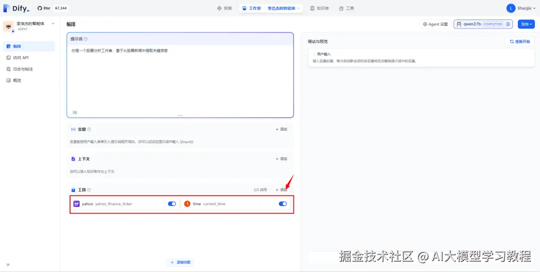 Dify的工具是指一些让AI调用外部功能的插件,比如搜索、发微信或者查询数据,就像给AI装上手和脚,能自动执行现实任务。也可以自定义工具给Dify调用,或者将已发布的工作流发布成工具进行使用。