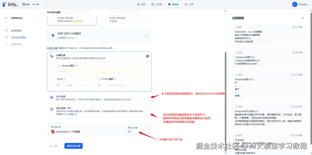 上传文档之后我们可以在召回测试窗口问个问题,已测试下命中率吧。我根据文档内容问了“DeepSeek是什么?”,并以向量检索的方式进行检索,命中三个分段如果我问一个不相关的问题,通过向量检索的方式也是可以找到的,但实际结果可能没那么理想