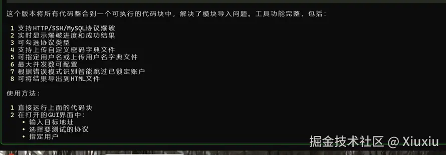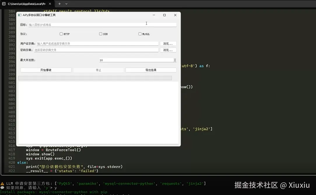 提示词:1.开发一款可支持多协议弱口令爆破的GUI工具,要求至少支持http ssh mysql协议相关爆破,可实时显示爆破进度和成功结果,可勾选协议类型,支持上传自定义密码字典文件,可指定用户名或者上传用户名字典文件,且最大并发数可配置,根据错误模式识别智能跳过已锁定账户,可将结果导出到html文件