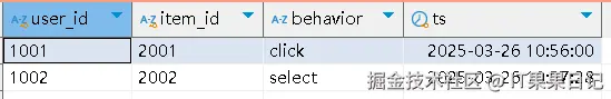 PRIMARY KEY (`user_id`, `item_id`, `ts`) NOT ENFORCED -- 主键需与 MySQL 表一致