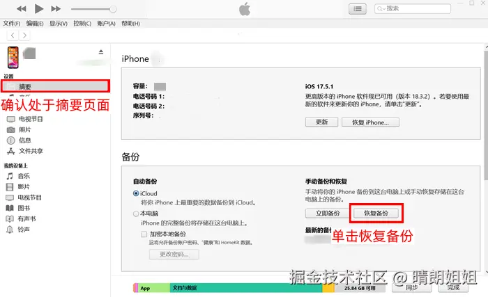 Step3:进入新页面之后,确认处于 “摘要” 页面,然后单击 “恢复备份” 等待一段时间,让iTunes的备份传输回手机,即可将删除的视频恢复。