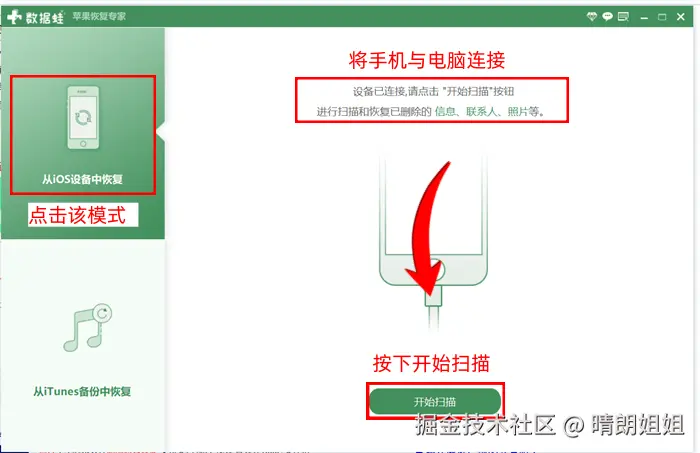 Step2:将手机与电脑连接,连接好后,再按下 “开始扫描” 进行扫描数据。