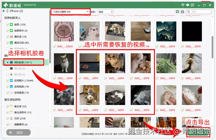 Step4:然后选中所需要恢复的视频,最后点击 “导出” 就能把删了的视频恢复到电脑上。