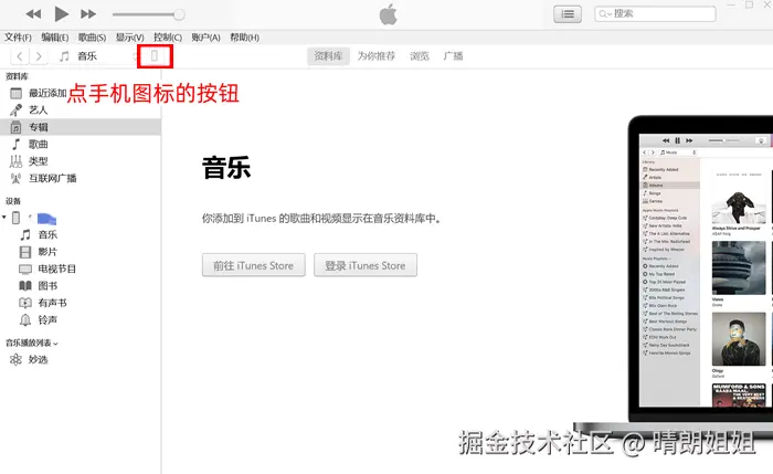 Step2:进入iTunes主页面,点其上方手机图标的按钮。