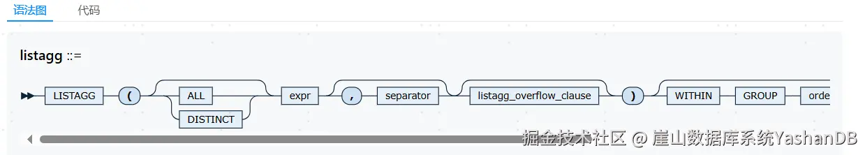 LISTAGG函数将多行的expr执行拼接操作,并通过分隔符分隔,返回一行VARCHAR/RAW类型的字符串。