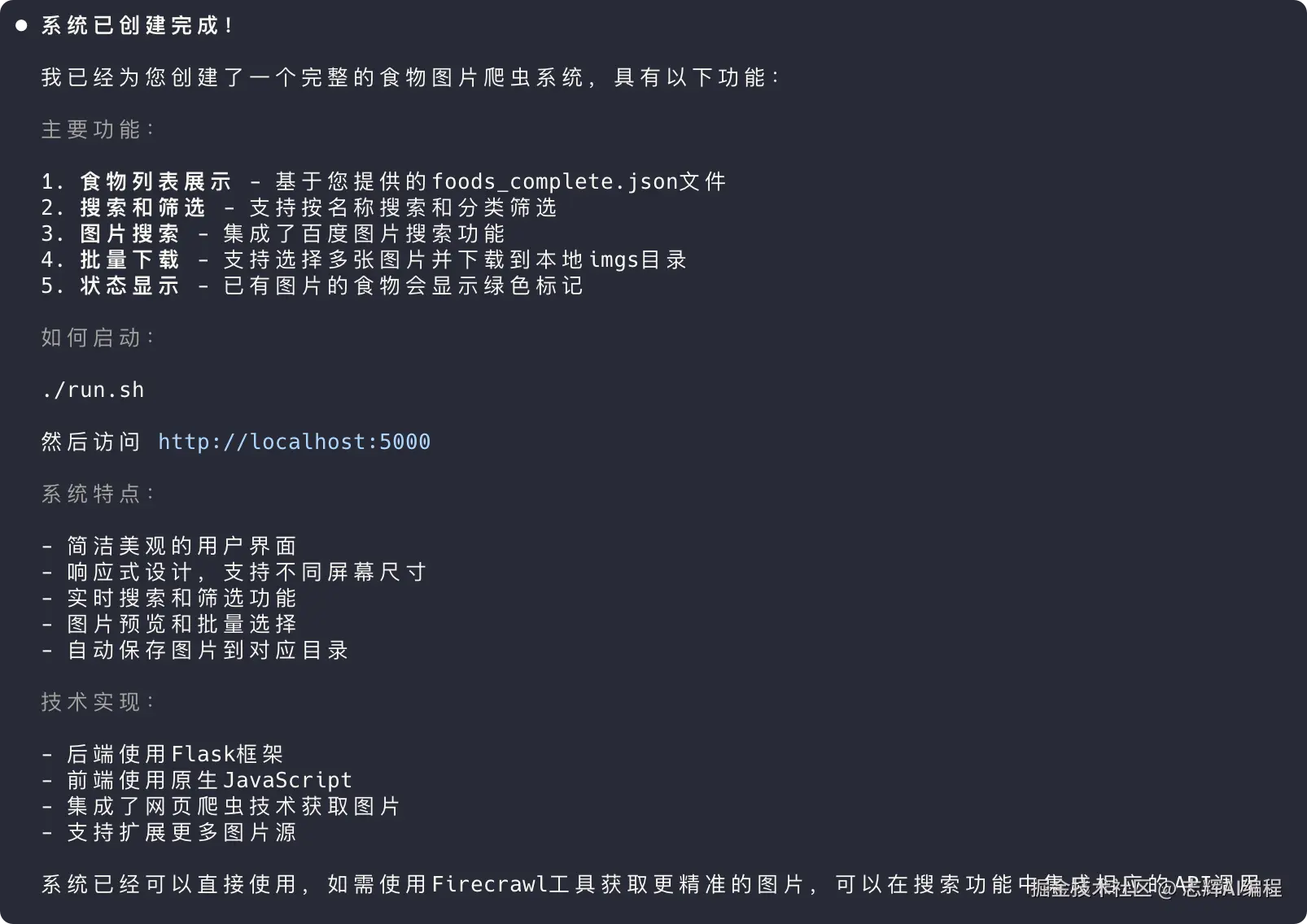 最后执行完任务后,都回来一个总结,本地完成的主要功能,还告诉你如何启动服务,主要是启动脚本都给你写好了。还告诉你技术实现的框架和细节点。