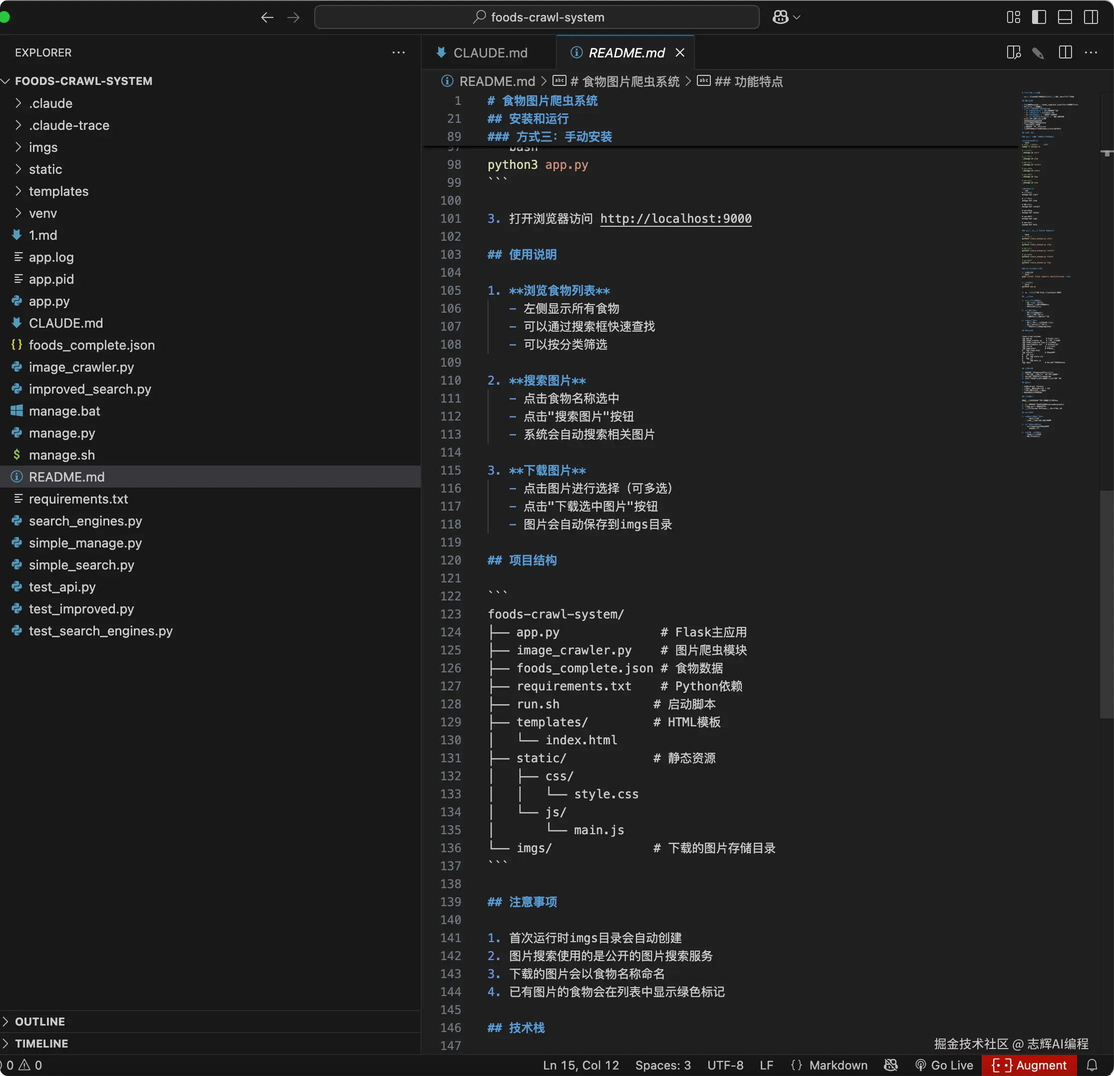 中间还让他弄了些启动脚本的管理,还有一些样式的调整,并且聪明到很么底部,README.md文档里的内容我一个字都没有修改过,每次修改代码后,如果有更新README.md的内容,它会自动更新,这就比人工维护好很多(平时遇见最多的问题就是,代码和文档是远远对应不上的,基本文档就是第一版,后续很少更新,都是的去看代码,这就很费劲。)