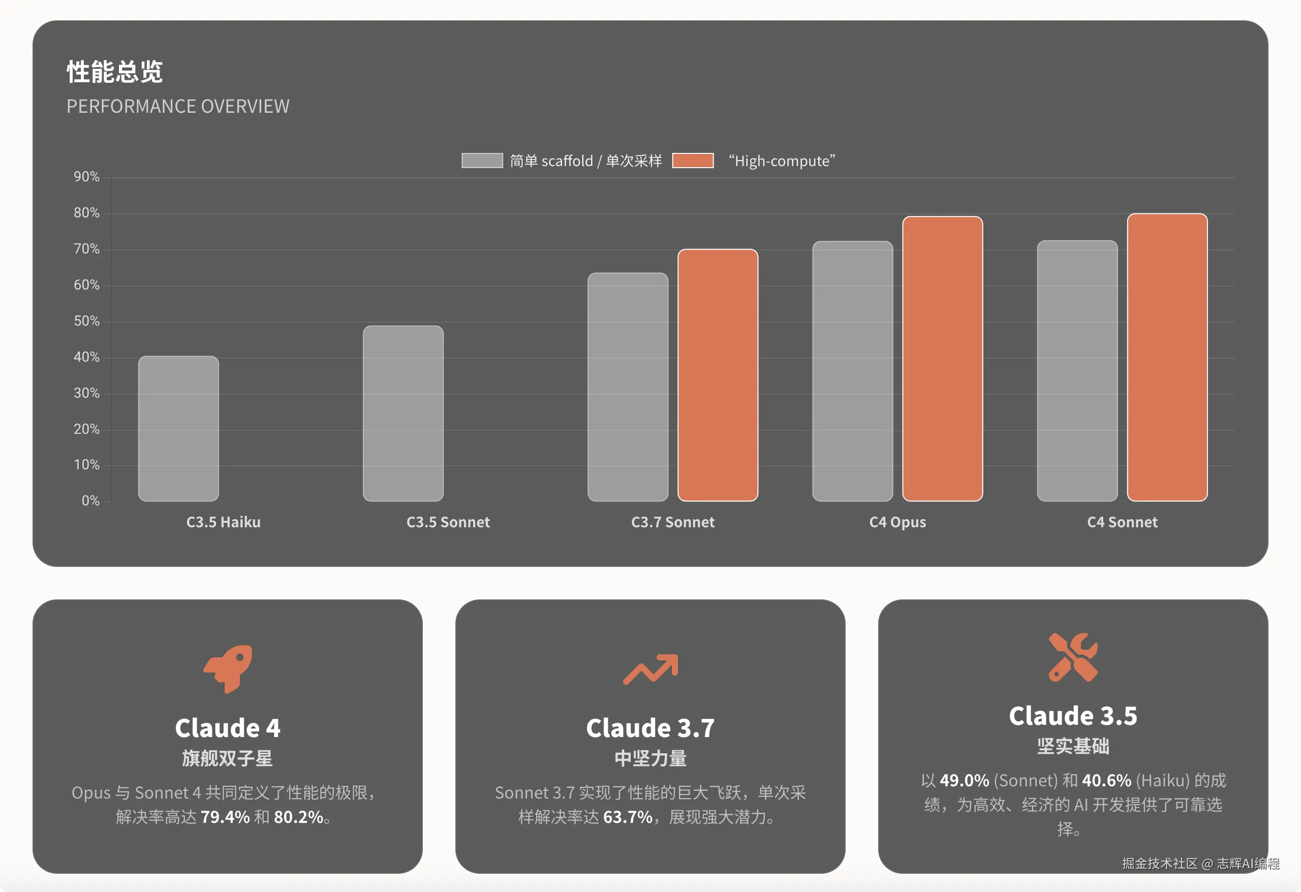只能说现在的大模型能力越来越强,目前Claude 4 的 SWE评分打开在70%多,从去年的Claude3.5的40%分,AI编程正式开发进入大家的视野,到今年的 4 版本,才不到一年的时间,基本上涨了 30% 的空间,等到突破 90% 的时候,我相信大家的工作方式还有我们日常的生活都会大大的改变。