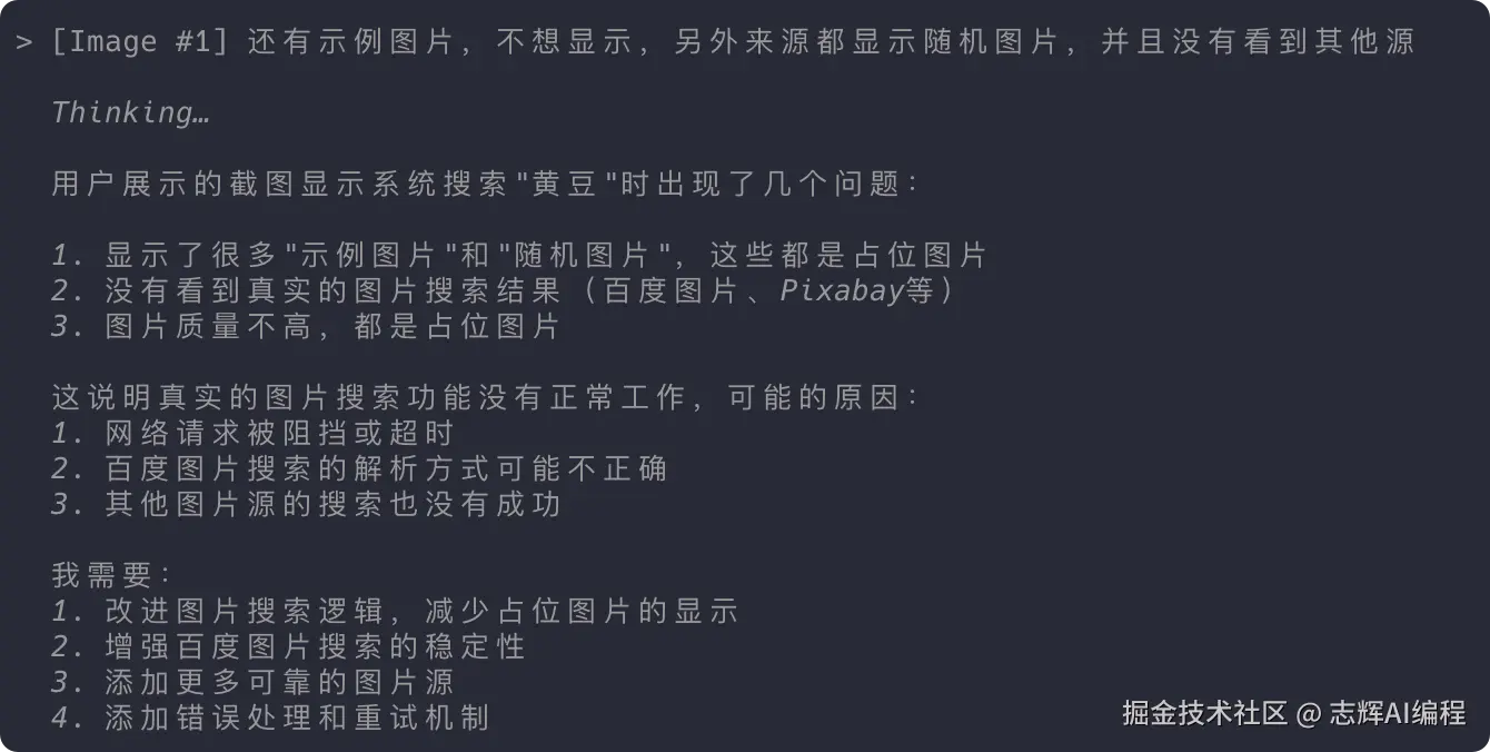 我们把上面的图片直接拖拽到终端,或者复制全路径直接粘贴到终端,就会有「Image #1」字样,然后输入问题,Claude Code就可以识别图片的内容,开始处理问题了。